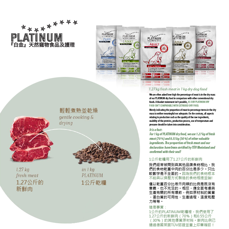食材由鮮肉本身的肉汁煮熟,最後保留19%的水分含量,使PLATINUM『白金』鮮肉糧成為犬隻理想的"多汁" "乾"糧。 百份百鮮肉的味道,所有狗狗都會愛上它!